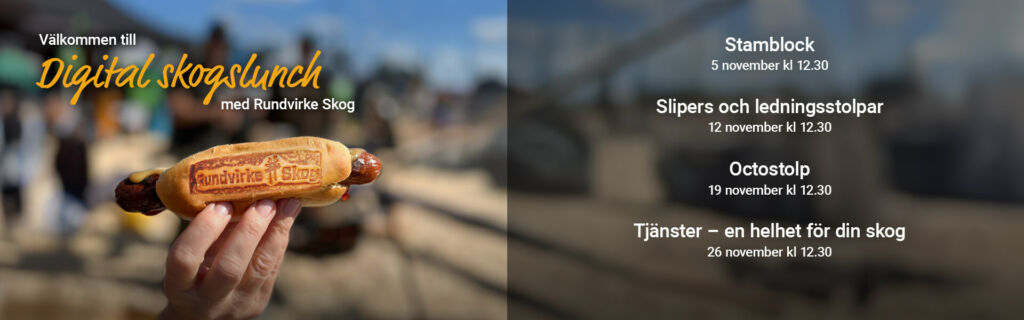 Boka in onsdagsluncherna i november – då sänder vi på Rundvirke Skog Digital skogslunch där vår vd Fredrik Granath bjudit in kunniga gäster med fokus på våra specialsortiment och våra tjänster! Vi kör igång med vår första digitala skogslunch onsdagen den 5 november och då dyker vi ner i sortimentet stamblock. Våra tre första skogsluncher – stamblock, slipers och ledningsstolpar samt octostolp, riktar sig till dig som på något vis arbetar med våra specialsortiment via t ex inköp, avverkning, leveranser m.m. – eller till dig som “bara” är nyfiken på våra specialsortiment och förädlingsanläggningar. Den sista sändningen handlar om våra tjänster där du som är skogsägare får en övergripande bild av vad vi kan hjälpa dig och din skog med.